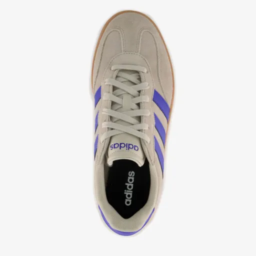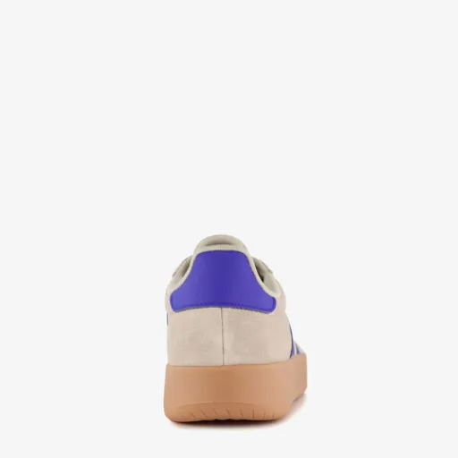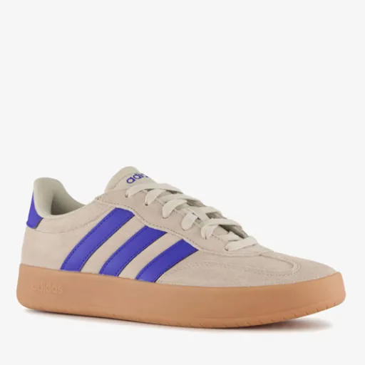 Beige Adidas Barreda sneakers voor heren. Het buitenwerk is gemaakt van imitatieleer, het binnenwerk van textiel en de profielzool is van rubber. Voorzien van een vetersluiting en een comfortabele binnenzool van textiel. Deze is niet uitneembaar. De sneakers hebben een bruine buitenzool, blauwe details en blauwe Adidas 3-Stripes op de zijpanden.