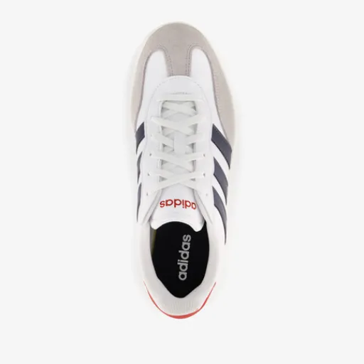Witte Adidas Barreda sneakers met rode details voor heren. Gemaakt van synthetisch leer en suede, een binnenwerk van textiel en een rubberen cupzool. De sneakers hebben een vetersluiting en comfortabel voetbed van textiel. Deze is niet uitneembaar. Voorzien van iconische Adidas 3-Stripes op de zijpanden in het zwart.