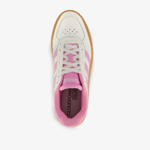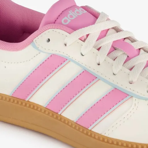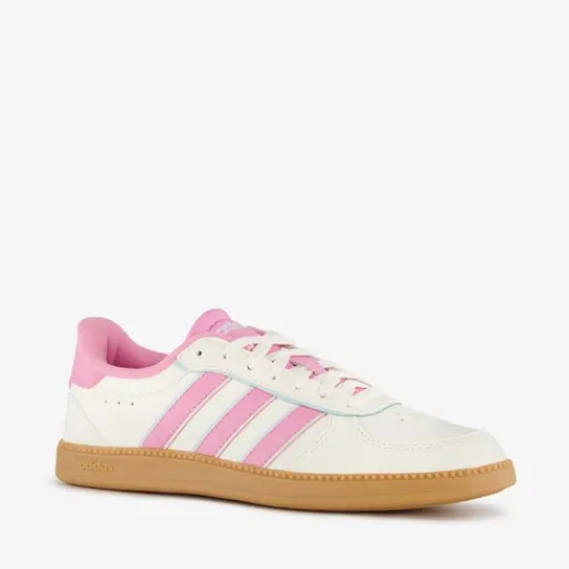 Witte Adidas Breaknet Sleek sneakers voor meisjes. Het bovenwerk is gemaakt van imitatieleer, het binnenwerk van textiel en de profielzool is van rubber. Voorzien van een vetersluiting en een uitneembare binnenzool van textiel. De sneakers hebben een bruine buitenzool, roze accenten en roze 3-Stripes aan de zijkanten.