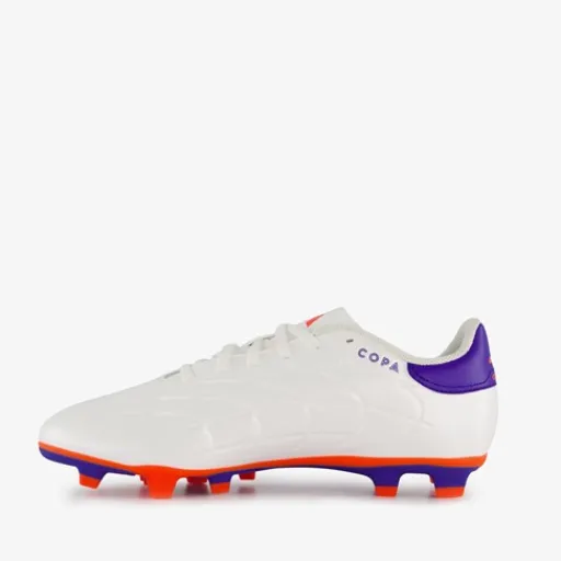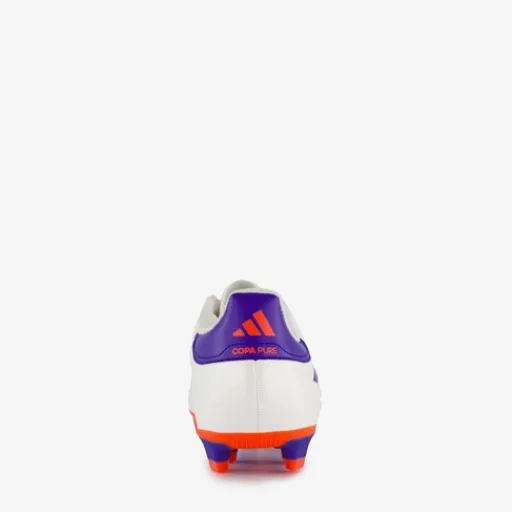 Witte Adidas Copa Pure 2 Club MG voetbalschoenen voor heren. Het buitenwerk is gemaakt van imitatieleer, het binnenwerk van textiel en de MG zool van rubber. De veelzijdige zool is geschikt voor harde natuurgrasvelden, zachte natuurgrasvelden en kunstgrasvelden. Voorzien van een vetersluiting en een uitneembare binnenzool van textiel. De schoenen worden versierd met blauwe en oranje accenten en de iconische 3-Stripes in het blauw aan de buitenzijde.