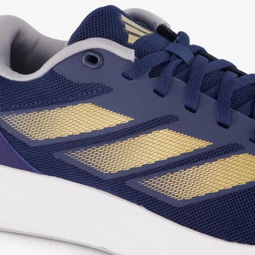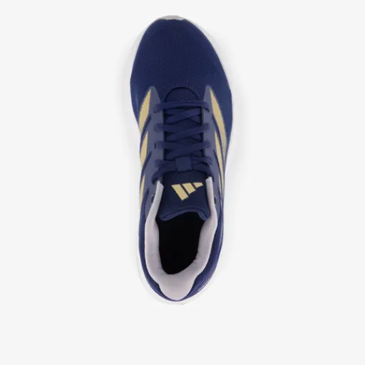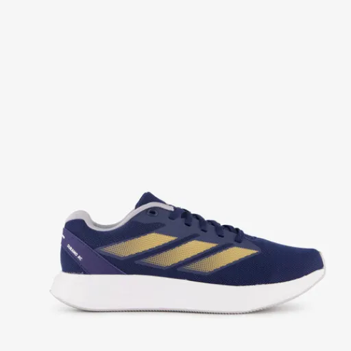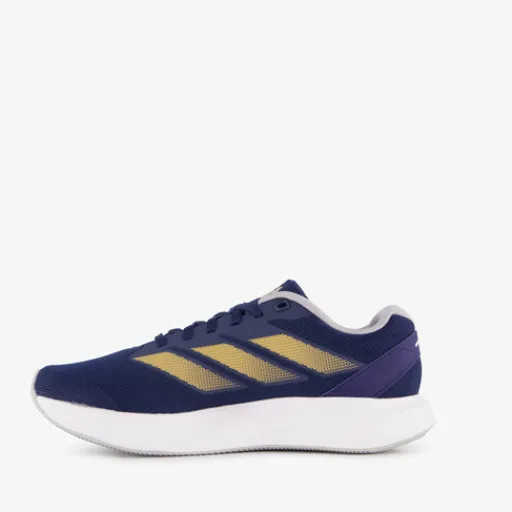 Blauwe Adidas Duramo RC hardloopschoenen voor dames. Het ademende bovenwerk is gemaakt van mesh, het binnenwerk is van textiel en de dikke zool met profiel is van rubber. Voorzien van een vetersluiting en comfortabele binnenzool van textiel. Deze is uitneembaar zodat je eventueel je eigen zolen in de schoenen kan dragen. De hardloopschoenen hebben goudkleurige Adidas 3-Stripes aan de zijkanten en een witte buitenzool.
