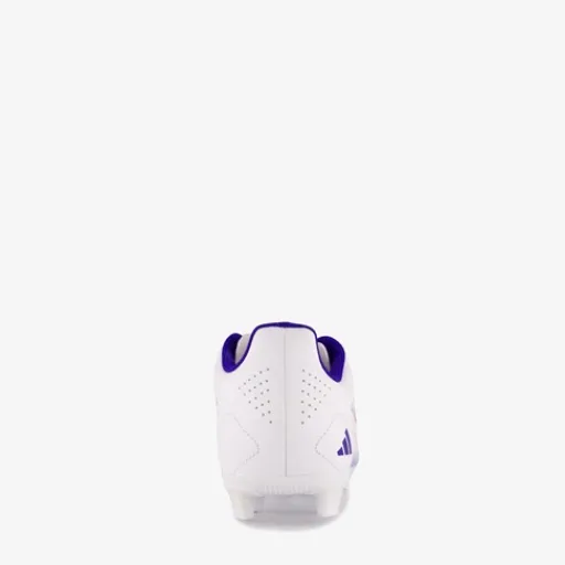Witte Adidas F50 Club MG voetbalschoenen voor kinderen. Het buitenwerk is gemaakt van imitatieleer, het binnenwerk van textiel en de MG zool van rubber. De zool is geschikt voor verschillende ondergronden als natuurgrasvelden en kunstgrasvelden. Voorzien van een vetersluiting en een uitneembare binnenzool van textiel. De schoenen hebben blauwe accenten en de iconische 3-Stripes in het oranje en aan de zijkanten.