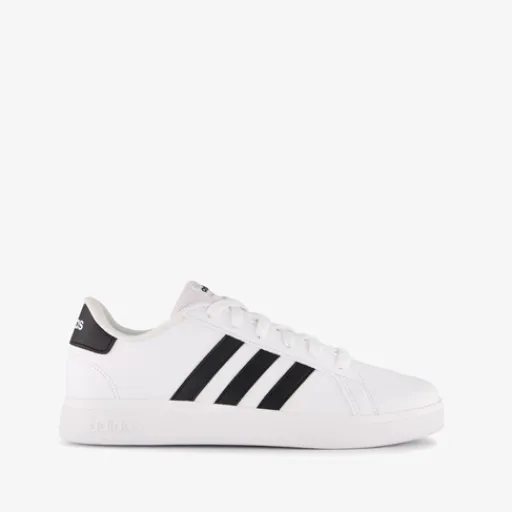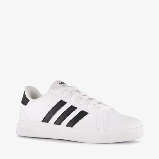 Witte Adidas Grand Court 2.0 sneakers voor jongens. Het buitenwerk is gemaakt van imitatieleer, het binnenwerk van textiel en de profielzool is van rubber. Voorzien van een vetersluiting en comfortabele binnenzool van textiel. Deze is uitneembaar. De sneakers hebben de iconische Adidas 3-Stripes in het zwart aan de zijkanten.