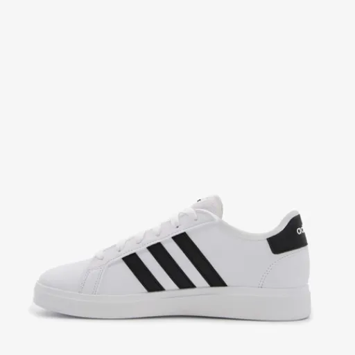 Witte Adidas Grand Court 2.0 sneakers voor kinderen. Gemaakt van imitatieleer met een binnenwerk van textiel en stevige profielzool van rubber. Voorzien van een vetersluiting voor een goede pasvorm en versierd met de iconische Adidas 3-Stripes in het zwart op de zijpanden. Het comfortabele voetbed is van textiel. Deze is uitneembaar.