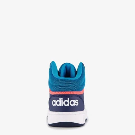 Hoge, blauwe Adidas Hoops Mid 3.0 sneakers voor kids. Het bovenwerk is gemaakt van imitatieleer, het binnenwerk is van textiel en de stevige zool met profiel van rubber. Voorzien van een vetersluiting en een comfortabele binnenzool van textiel. Deze gave sneakers worden versierd met witte en oranje details. Binnenzool is uitneembaar.