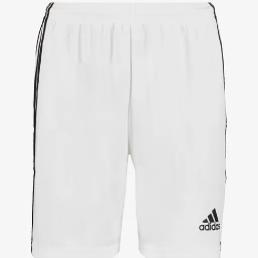 Witte Adidas Squadra 21 sportshort voor heren. Voorzien van een elastische boord met aantrekkoordjes en zwarte Adidas 3-Stripes langs de benen. Deze comfortabele sportshort is gemaakt van AEROREADY-materiaal wat vocht absorbeert wat extra fijn is tijdens een flinke sportsessie. Gemaakt van 100% polyester.