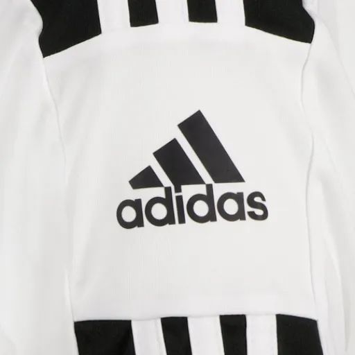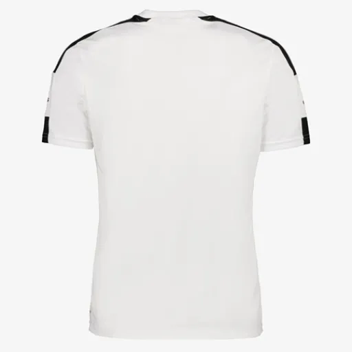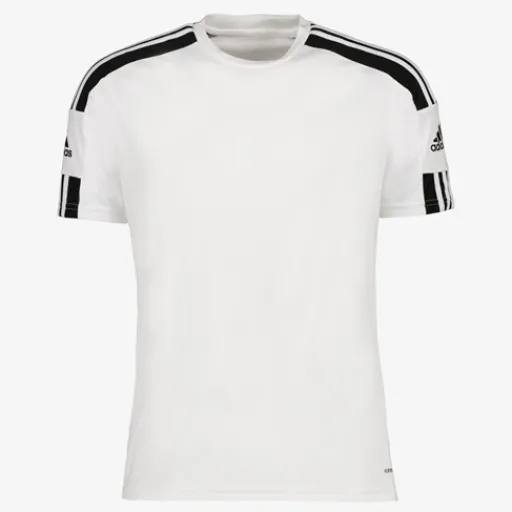 Witte Adidas Squadra 21 sport T-shirt voor heren. Voorzien van korte mouwen en een hoge, ronde hals. Het T-shirt heeft zwarte strepen en merkaccenten op de mouwen en schouders. Aangename pasvorm met veel bewegingsvrijheid en een goede afvoer van transpiratievocht. Het Adidas T-shirt is gemaakt van polyester.;