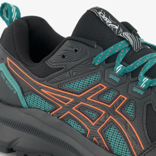 Zwarte Asics Trail Scout 3 hardloopschoenen voor heren. Het ademende bovenwerk is gemaakt van mesh en imitatieleer, het binnenwerk is van textiel en de flexibele buitenzool met profielzool is van rubber. Voorzien van een vetersluiting, hiellusjes en een comfortabele binnenzool van textiel. Deze is uitneembaar. Het kan zijn dat je stevig aan de binnenzool moet trekken om deze eruit te krijgen. De buitenzool is ontworpen om ook op offroad-oppervlakken te gebruiken. De Asics Trail Scout 3 hebben een EVA-tussenzool met de JOLTâ„¢ 4 constructie wat de juiste demping en steun biedt tijdens het hardlopen op onverharde wegen. Op het buitenwerk van deze sportschoenen zijn blauwe en oranje details aangebracht.