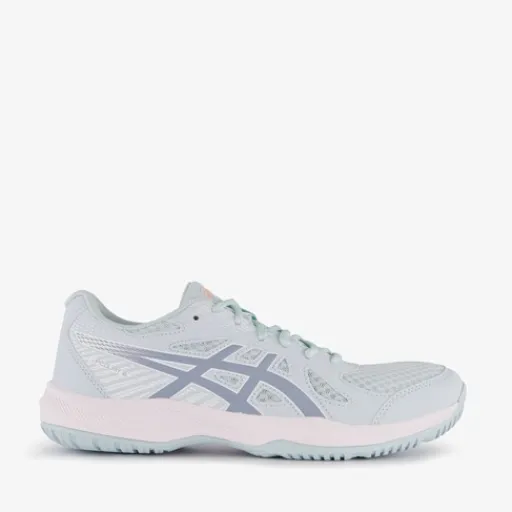 Lichtblauwe Asics Upcourt 6 zaalschoenen voor dames. Het buitenwerk van deze lichte schoenen is gemaakt van mesh, het binnenwerk van textiel en de flexibele profielzool is van rubber. Voorzien van een vetersluiting en een comfortabele binnenzool van textiel. Deze is uitneembaar zodat je eventueel jouw eigen zolen in de schoenen kan dragen.