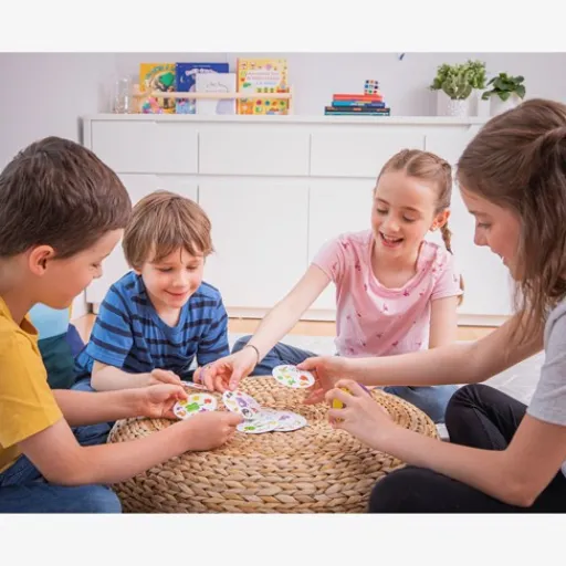 Dit is een geweldig spel waarbij je goed moet observeren én snel moet zijn! Je hoeft hier niet op je beurt te wachten, want iedereen speelt tegelijkertijd. Iedereen legt een kaart dicht voor zich neer, en er gaat een stapel met de figuren naar boven in het midden. Daarna opent iedereen tegelijk zijn kaart en gaat op zoek! Kijk goed en snel of er een symbool op jouw kaart hetzelfde is als die in het midden. Roep dan snel welk symbool dat is en leg de kaart op jouw kaart. Het spel gaat direct verder met de nieuwe kaart van de stapel in het midden! Wanneer alle kaarten in het midden weg zijn, telt iedereen zijn kaarten. Heb jij de meeste? Dan ben je de winnaar van dit vliegensvlugge spel!¶Er zijn nog meer leuke spelletjes te spelen met Dobble, probeer ze allemaal!¶¶Inhoud: 55 ronde kaarten, spelregels¶¶Dobble is geschikt voor twee tot acht spelers vanaf zes jaar.