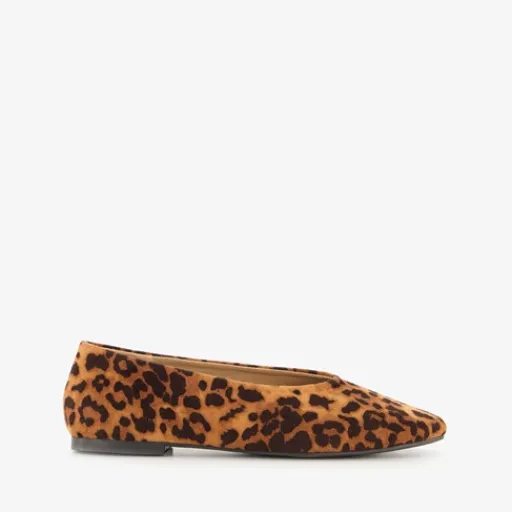 Bruine ballerina’s met een panterprintje voor dames uit de Blue Box collectie. Het buitenwerk is gemaakt van imitatieleer, het binnenwerk van textiel en de buitenzool is van rubber. De binnenzool van synthetisch materiaal is niet uitneembaar.