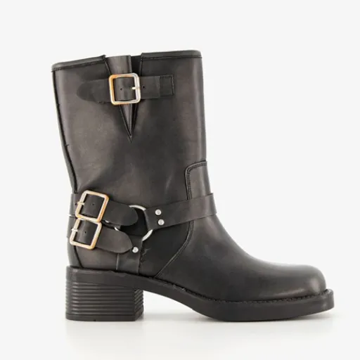 Zwarte biker boots voor dames van Blue Box. Het buitenwerk is gemaakt van imitatieleer, het binnenwerk van textiel en een buitenzool van rubber. Voorzien van en rissluiting aan de binnenzijde en siergespen aan de bijtenzijde. Deze stoere laarzen hebben een vast voetbed, een lage hak van circa 2,5 cm en een schachthoogte van 19 cm.