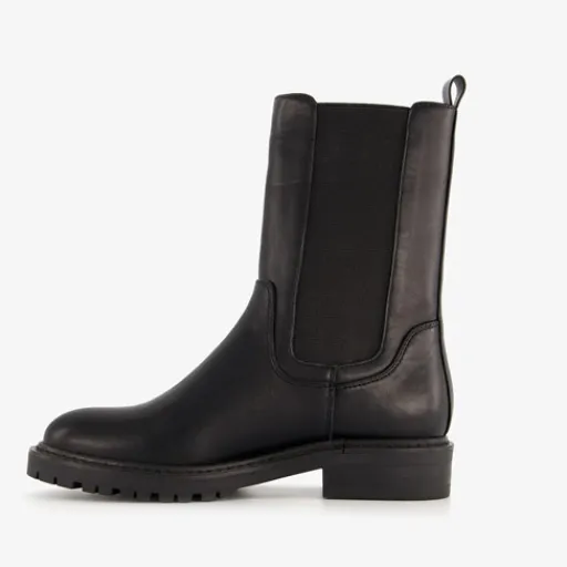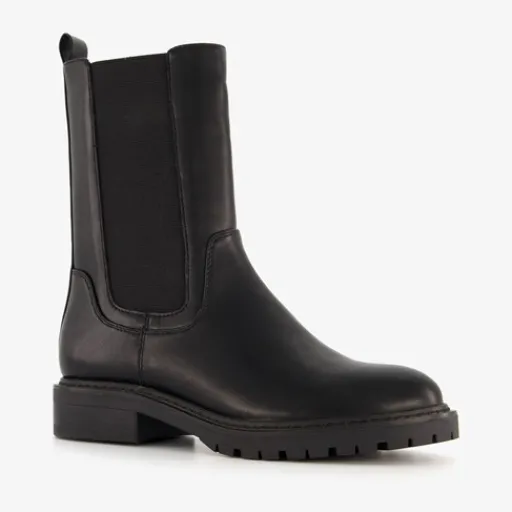 Halfhoge, zwarte chelsea boots voor dames. Gemaakt van imitatieleer, een binnenwerk van textiel en een rubberen zool. De boots hebben elastische inzetten voor een makkelijke instap. Het vaste voetbed is gemaakt van imitatieleer. De chelsea boots hebben een schachthoogte van 20 cm en een lage hak van circa 2 cm.