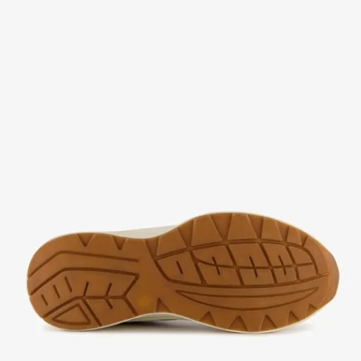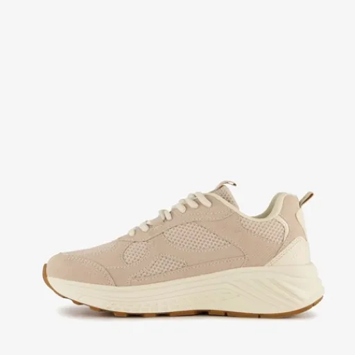 Beige dad sneakers voor dames. Gemaakt van imitatiesuede en textiel, een binnenwerk van textiel en een rubberen zool. De sneakers hebben een vetersluiting en comfortabel voetbed van textiel. Deze is uitneembaar. Voorzien van mesh inzetten op het bovenwerk en een chunky zool.
