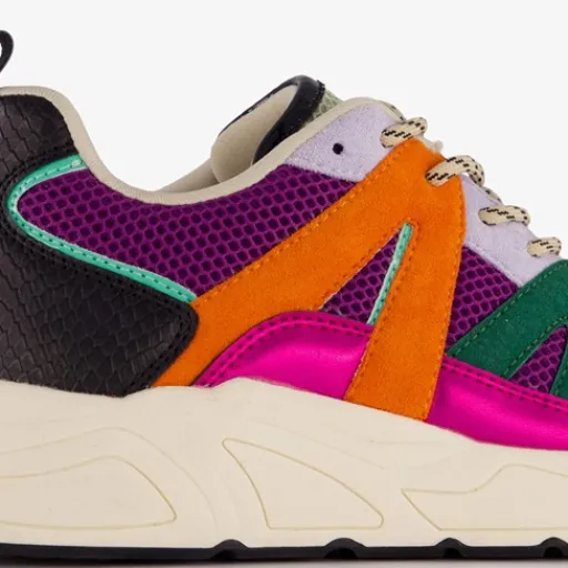 Gekleurde dad sneakers voor dames van Blue Box. Gemaakt van imitatieleer en textiel met een binnenwerk van textiel en een rubberen profielzool. De sneakers hebben een vetersluiting en aantreklusjes op de tong en hiel voor een makkelijke instap. Het uitneembare voetbed is gemaakt van imitatieleer. Voorzien van o.a. oranje, paars en groene accenten op het bovenwerk en een grove zool.
