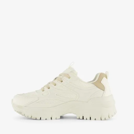 Witte dad sneakers voor dames van Blue Box. Gemaakt van imitatieleer met een binnenwerk van textiel en een rubberen profielzool. De sneakers hebben een vetersluiting en lusjes op de hiel en tong voor een makkelijke instap. Het comfortabele voetbed is gemaakt van textiel. Deze is niet uitneembaar. De dad sneakers hebben beige accenten en een chunky zool.
