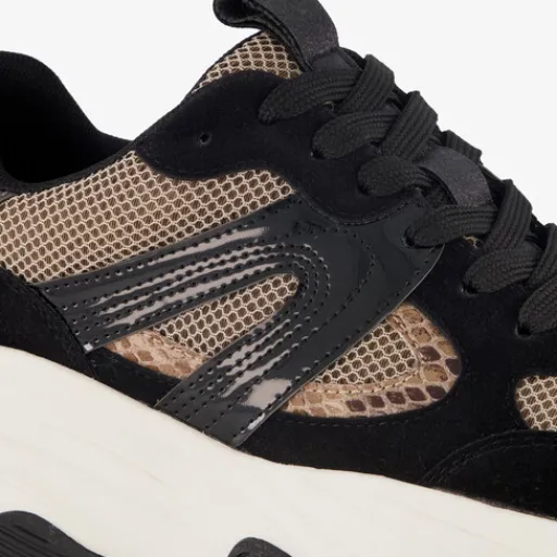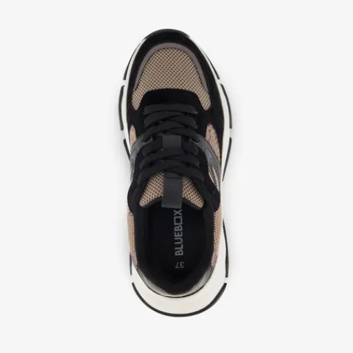 Zwarte dames dad sneakers van Blue Box Het buitenwerk is gemaakt van textiel en imitatieleer, het binnenwerk van textiel en de stevige zool met profiel is van rubber. Voorzien van een vetersluiting en een aantreklusje op de tong. De sneakers hebben beige accenten en een wit-zwarte buitenzool. Binnenzool is uitneembaar.