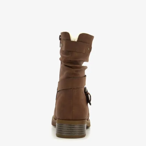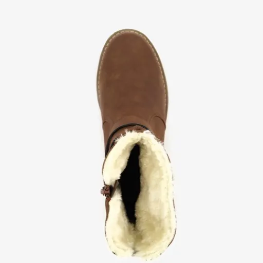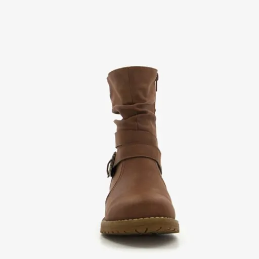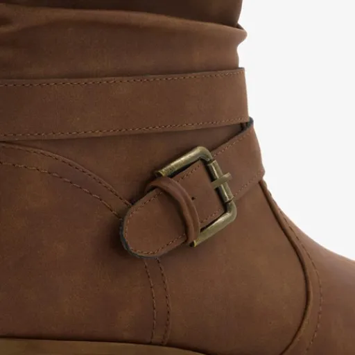 Cognac bruine enkellaarsjes voor dames van Blue Box. Gemaakt van imitatieleer, een binnenwerk van textiel en een stevige profielzool. De laarsjes hebben een ritssluiting aan de binnenzijde en een decoratieve gesp rondom de voet. De vaste binnenzool is gemaakt van textiel. De enkellaarsjes hebben een schachthoogte van 18 cm en een laag hakje van circa 2 cm.