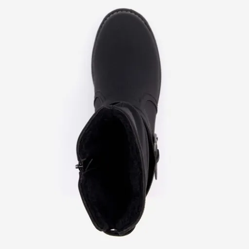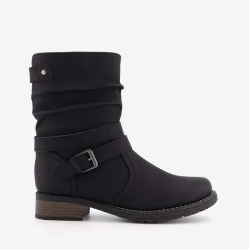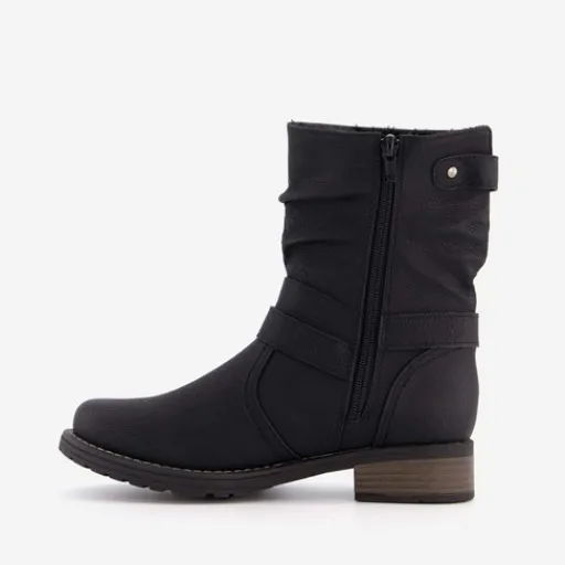 Zwarte enkellaarsjes voor dames van Blue Box. Gemaakt van imitatieleer, een binnenwerk van textiel en een stevige profielzool. De laarsjes hebben een ritssluiting aan de binnenzijde en een bandje met gesp rondom de enkel. De vaste binnenzool is gemaakt van textiel. De enkellaarsjes hebben een schachthoogte van 18 cm en een laag hakje van circa 2 cm.