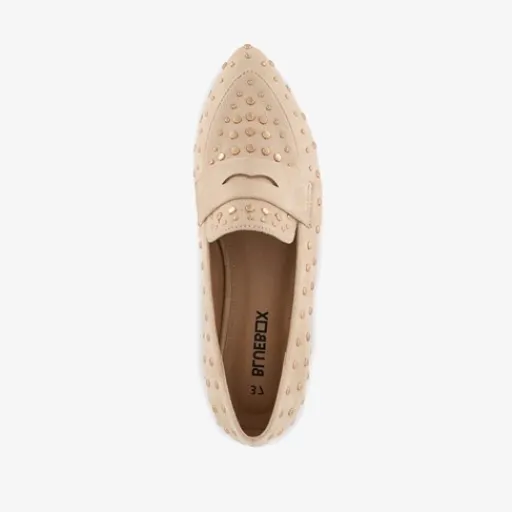 Beige dames loafers met goudkleurige studs uit de Blue Box collectie. Het buitenwerk is gemaakt van imitatiesuède, het binnenwerk van textiel en de buitenzool is van rubber. De loafers hebben een puntige neus en een laag hakje van circa 2 cm. Het comfortabele voetbed van textiel is niet uitneembaar.