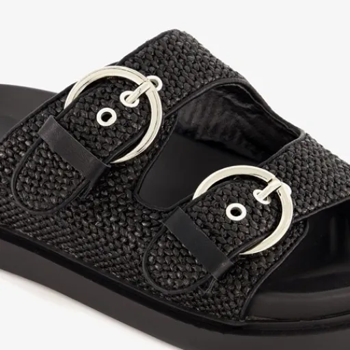 Zwarte slippers voor dames van Blue Box. Gemaakt van imitatieleer met een binnenwerk van textiel en een stevige profielzool van rubber. De slippers hebben twee voetbanden met een zilverkleurige gespsluiting.
