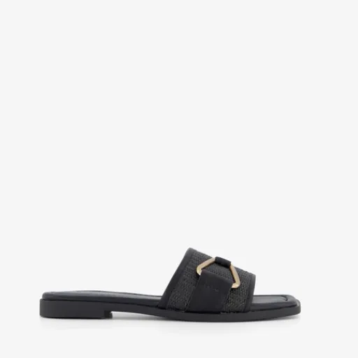 Zwarte slippers voor dames van Blue Box. Voorzien van een brede teenband met een gesp en een vast voetbed van synthetisch materiaal. De sandalen zijn gemaakt van imitatieleer.