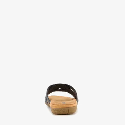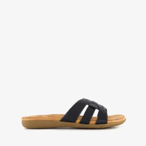 Zwarte slippers voor dames uit de Blue Box collectie. Het bovenwerk is gemaakt van imitatieleer en de buitenzool met profiel is van rubber. De slippers hebben een brede band bij de tenen en een comfortabele binnenzool van textiel. Deze is niet uitneembaar.