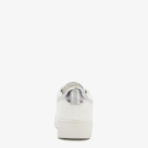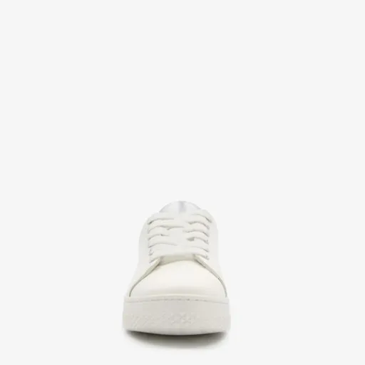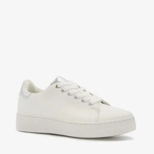 Witte sneakers voor dames van Blue Box. Gemaakt van imitatieleer, een binnenwerk van textiel en een rubberen zool. De sneakers hebben een vetersluiting en uitneembaar voetbed van textiel. Voorzien van metallic zilveren details op de hiel en tong.