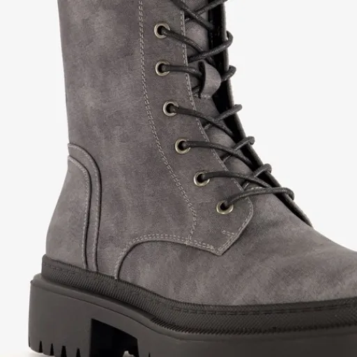 Grijze veterboots voor dames van Blue Box. Gemaakt van imitatieleer, een binnenwerk van textiel en een rubberen zool. De boots hebben een vetersluiting en rits aan de binnenzijde. Het vaste voetbed is gemaakt van imitatieleer. De veterboots hebben een schachthoogte van 18 cm en een lage hak van 2,5 cm.