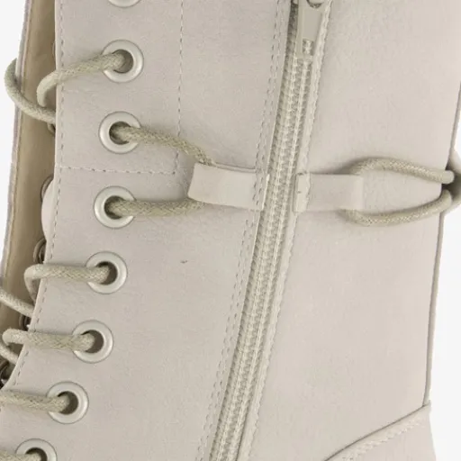 Lichtgrijze veterboots van Blue Box. Gemaakt van imitatieleer, een binnenwerk van textiel en een rubberen zool. De boots hebben een vetersluiting en een rits aan de binnenzijde. De veters kun je rondom de schoen strikken voor een leuk detail. Het vaste voetbed is gemaakt van imitatieleer. De veterboots hebben een schachthoogte van 18 cm en een lage hak van 2,5 cm.