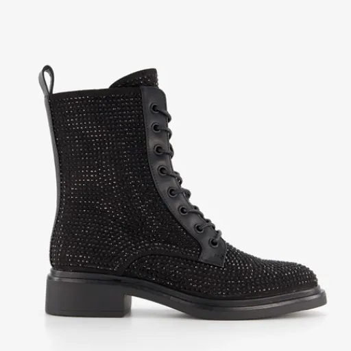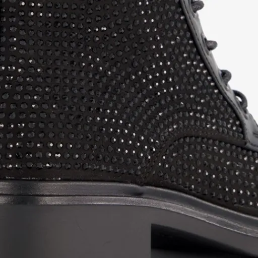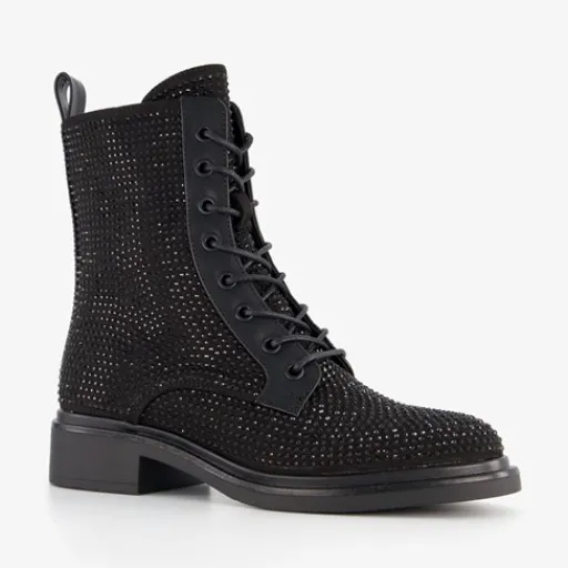Zwarte veterboots voor dames. Gemaakt van imitatieleer, een binnenwerk van textiel en een rubberen zool. De boots hebben een vetersluiting en rits aan de binnenzijde. Het vaste voetbed is gemaakt van imitatieleer. De veterboots hebben glinsterende steentjes op het bovenwerk.