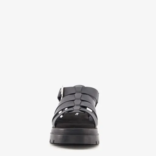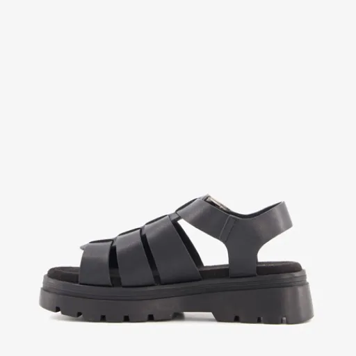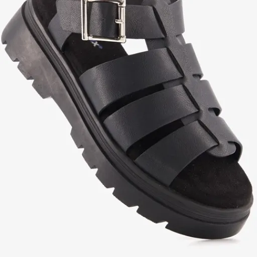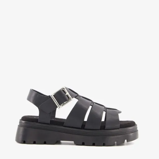 Chunky vissers sandalen voor dames van Blue Box in de kleur zwart. Gemaakt van imitatieleer, een binnenwerk van imitatieleer en een stevige zool. De sandalen hebben meerdere bandjes over de wreef en een bandje met gespsluiting om de enkel. Het zachte, comfortabele voetbed is gemaakt van textiel en is niet uitneembaar. De zwarte sandalen hebben een chunky zool van circa 3 cm hoog.