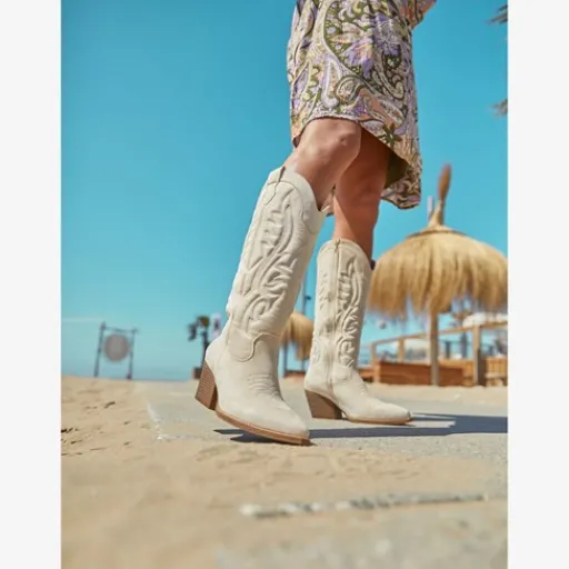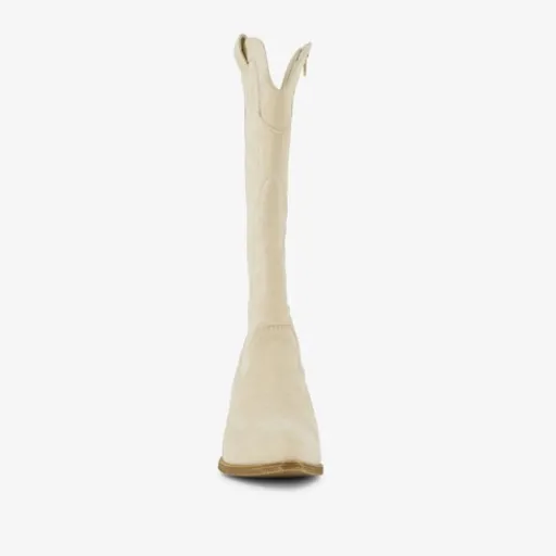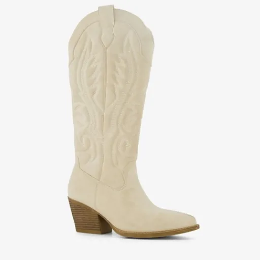 Hoge, crème witte western laarzen voor dames uit de Blue Box collectie. Het buitenwerk is gemaakt van imitatieleer, het binnenwerk van textiel en de buitenzool van rubber. Voorzien van een ritssluiting aan de binnenzijde en aantreklusjes aan de buitenkant. De laarzen hebben een geborduurd design op de schacht. Binnenzool is niet uitneembaar. De boots hebben een blokhak van circa 6 cm en een schachthoogte van 36 cm.