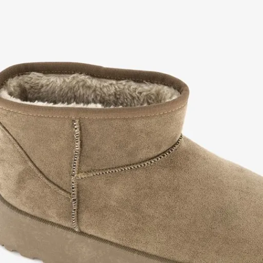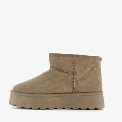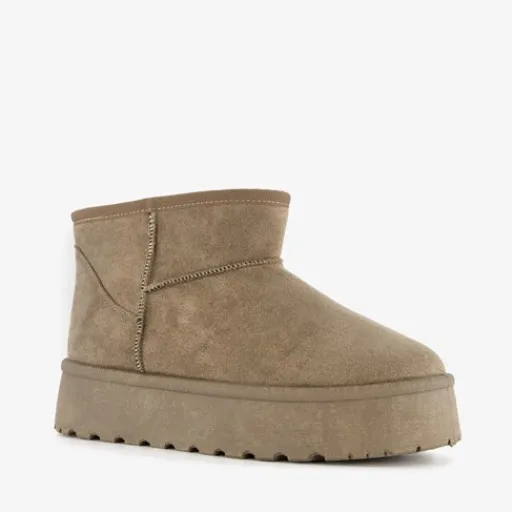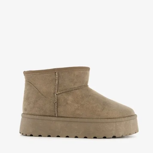 Beige, lage gevoerde enkellaarsjes van Blue Box. Deze stijlvolle laarsjes hebben een lage schacht en zijn voorzien van een platformzool. Het binnenwerk van de laarsjes is helemaal gevoerd. De binnenzool is gemaakt van textiel, deze is niet uitneembaar. De schachthoogte is circa 9 cm. De hakhoogte 4 cm.