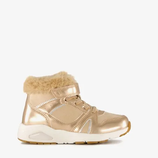 Hoge, goudkleurige sneakers voor meisjes van Blue Box. Gemaakt van imitatieleer, een binnenwerk van textiel en een rubberen zool. De sneakers hebben elastische veters met klittenbandsluiting voor een makkelijke instap. Het voetbed is uitneembaar en gemaakt van textiel. Voorzien van een zachte, warme voering van imitatiebont.