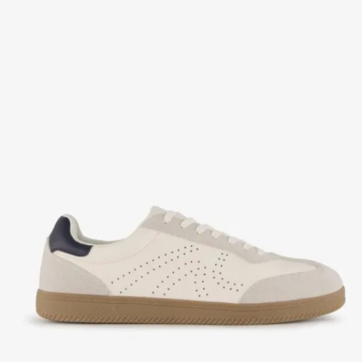 Lage, witte sneakers voor heren van Blue Box. Gemaakt van imitatieleer, een binnenwerk van textiel en een rubberen zool. De sneakers hebben een vetersluiting en vast voetbed van textiel. Voorzien van decoratieve perforaties aan de buitenzijde en lichtgrijze details. De sneakers hebben een smalle leest, en zijn hierdoor geschikt voor smalle(re) voeten.