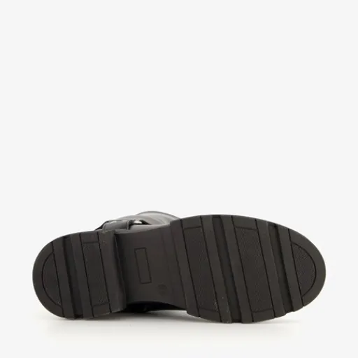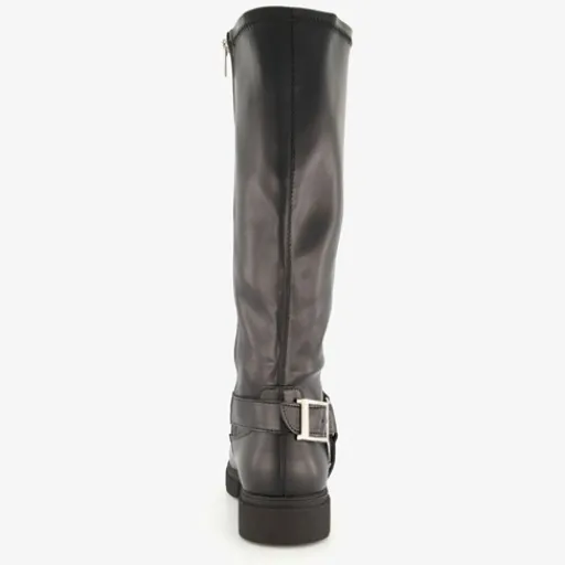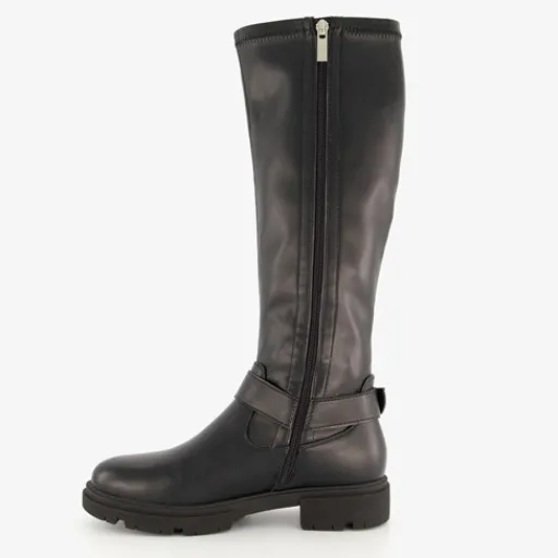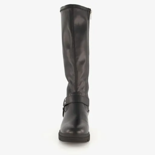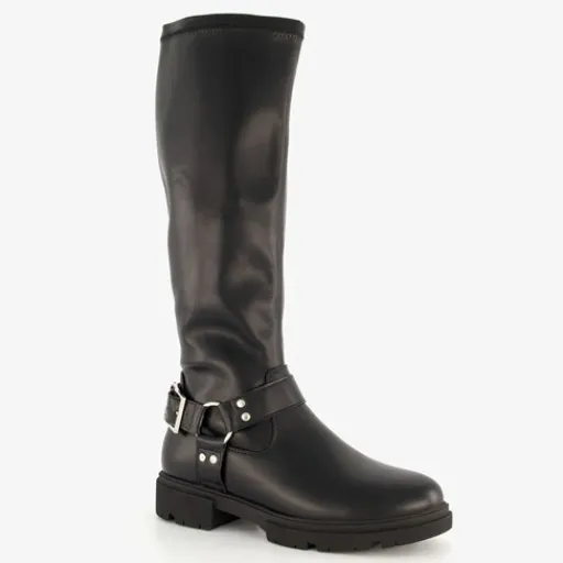 Hoge, zwarte laarzen voor dames van Blue Box. Gemaakt van imitatieleer, een binnenwerk van textiel en een rubberen zool. De stoere laarzen hebben een ritssluiting aan de binnenzijde en een comfortabel voetbed van imitatieleer. Deze is niet uitneembaar. Rondom de voet zit een decoratieve gesp. De hoge biker boots hebben een schachthoogte van 38 cm en een lage hak van circa 3 cm.