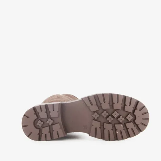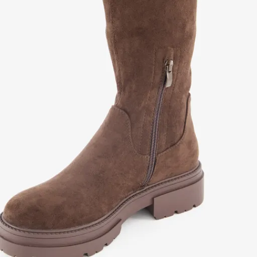 Hoge, bruine boots voor dames van Blue Box. Met een bovenwerk van imitatiesuede, een binnenwerk van textiel en een grove zool van rubber. De boots hebben een korte ritssluiting aan de binnenzijde en een vast voetbed van imitatieleer. De schachthoogte bedraagt 35 cm. De hoge boots hebben een dikke zool van circa 3 cm.