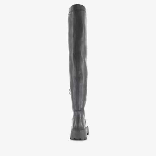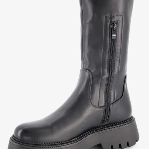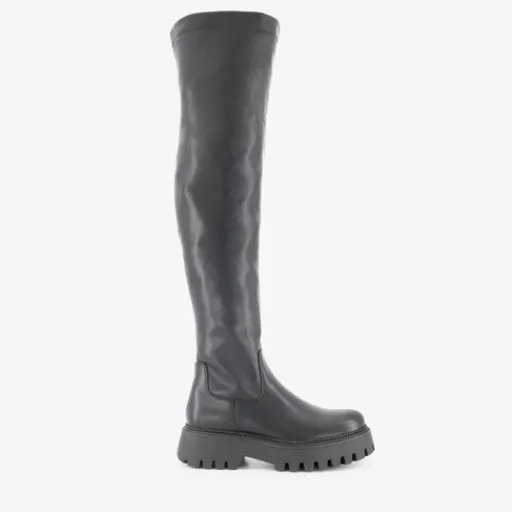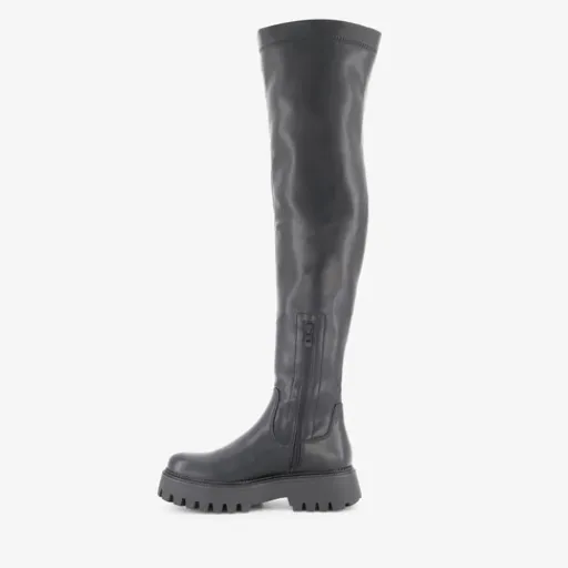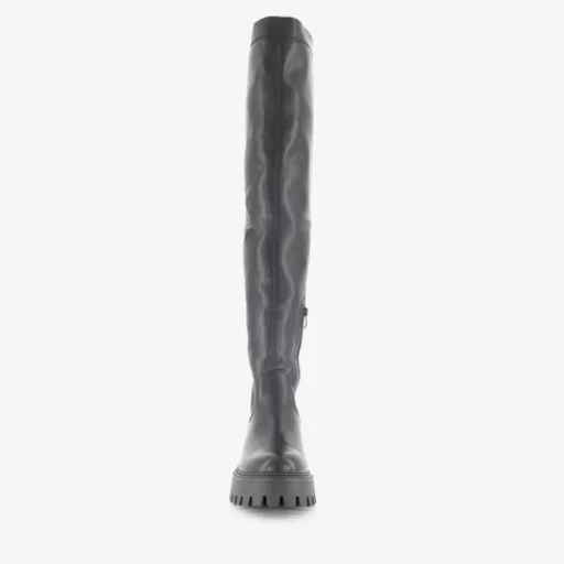 Hoge, zwarte boots voor dames van Blue Box. Gemaakt van imitatieleer, een binnenwerk van textiel en een rubberen zool. De hoge boots hebben een ritssluiting aan de binnenzijde en een vast voetbed van imitatieleer. Voorzien van een schachthoogte van 57 cm en een grove zool met een hoogte van circa 3 cm.
