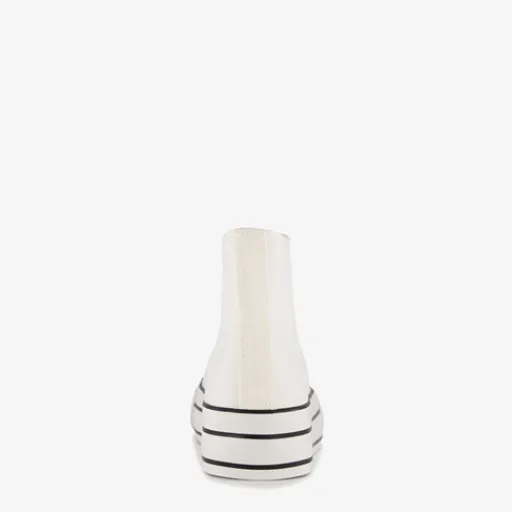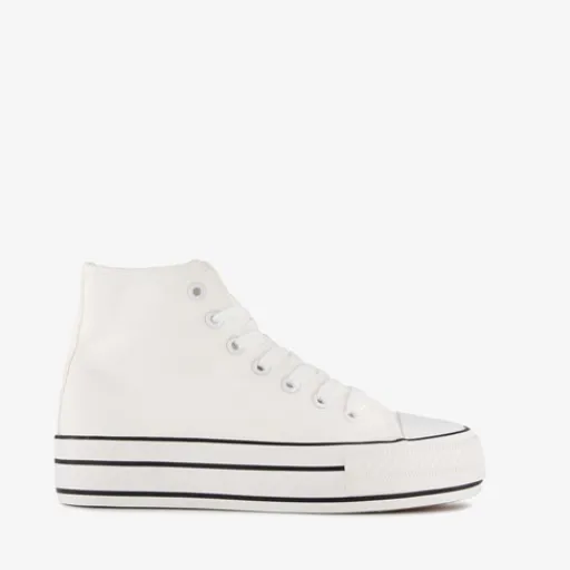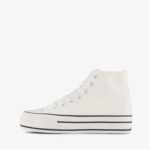 Hoge, witte gympen voor dames van Blue Box. Het buiten- en binnenwerk zijn gemaakt van textiel en de stevige zool met profiel is van rubber. De gympen hebben een vetersluiting en vast voetbed van textiel. Voorzien van een plateauzool met zwarte strepen. De plateauzool is 3.5 cm hoog en de schachthoogte is 10 cm.