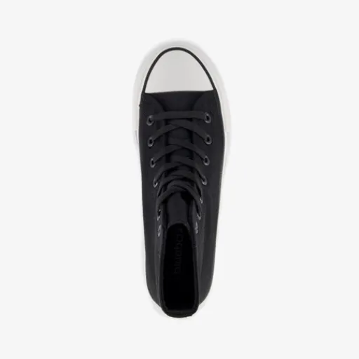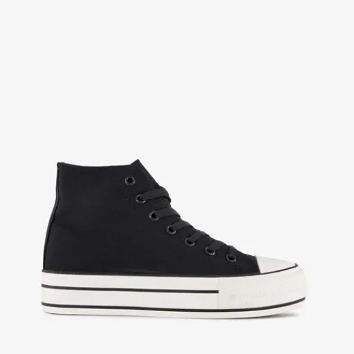 Hoge, zwarte gympen voor dames van Blue Box. Het buiten- en binnenwerk zijn gemaakt van textiel en de stevige zool met profiel is van rubber. De gympen hebben een vetersluiting en vast voetbed van textiel. Voorzien van een plateauzool met witte strepen. De plateauzool is 3.5 cm hoog en de schachthoogte is 10 cm.
