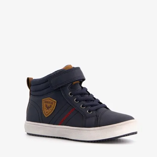 Donkerblauwe, hoge sneakers voor jongens van Blue Box. Gemaakt van imitatieleer, een binnenwerk van textiel een stevige profielzool. De boots hebben elastische veters met klittenbandsluiting voor een makkelijke instap. Het comfortabele voetbed is gemaakt van textiel. Deze is uitneembaar. Voorzien van stoere details op het bovenwerk en bruine accenten bij de tong en hak.
