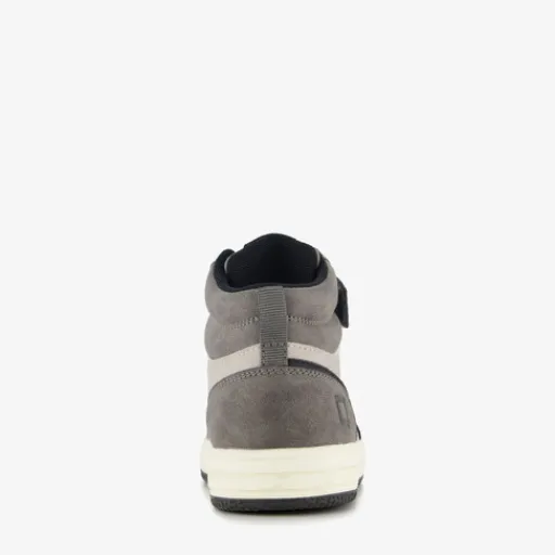 Hoge grijze Blue Box sneakers voor jongens. Het buitenwerk is gemaakt van imitatieleer, het binnenwerk van textiel en de stevige zool met profiel is van rubber. Voorzien van elastische veters en een klittenbandsluiting voor een optimale pasvorm en hiellusjes voor een makkelijke instap. De sneakers hebben zwarte details en een wit-zwarte buitenzool. De binnenzool is gemaakt van textiel en is niet uitneembaar.