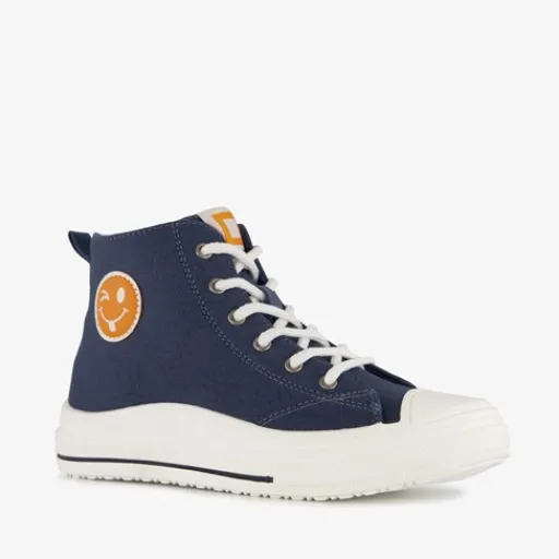 Hoge, blauwe sneakers voor jongens van Blue Box. Gemaakt van imitatieleer, een binnenwerk van textiel en een rubberen zool. De sneakers hebben een vetersluiting en rits aan de binnenzijde voor een makkelijke instap. Het vaste voetbed is gemaakt van textiel. De sneakers hebben een grote smiley aan de buitenzijde en een contrasterende, witte zool.