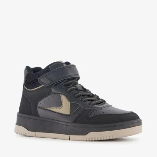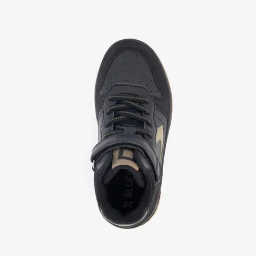 Zwarte, hoge jongens sneakers met beige accenten van Blue Box. Het buitenwerk is gemaakt van imitatieleer, het binnenwerk van textiel, en de stevige profielzool is van rubber. De sneakers zijn voorzien van elastische veters en een klittenbandsluiting voor een optimale pasvorm, en hebben een comfortabele binnenzool van textiel. Op het bovenwerk zijn perforatiegaatjes aangebracht die zorgen voor ventilatie. De binnenzool is niet uitneembaar.