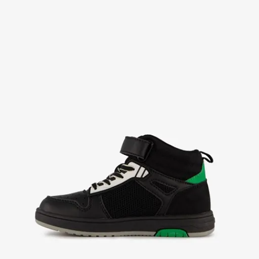 Hoge, zwarte jongens sneakers van Blue Box. Het buitenwerk is gemaakt van textiel en imitatieleer, het binnenwerk van textiel en de stevige zool met profiel van rubber. Voorzien van elastische veters met klittenbandsluiting voor een goede pasvorm en hiellusjes voor een makkelijke instap. Het comfortabele voetbed van synthetisch materiaal is uitneembaar zodat je eventueel jouw eigen zolen in de schoenen kan dragen. Deze stoere sneakers worden versierd met groene en blauwe accenten.