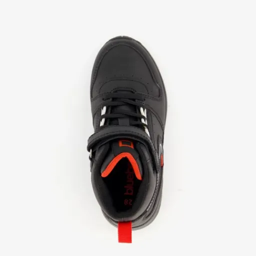 Hoge, zwarte sneakers voor jongens. Gemaakt van imitatieleer, een binnenwerk van textiel en een rubberen zool. De sneakers hebben elastische veters met klittenbandsluiting en een hiellusje. Het uitneembare voetbed is gemaakt van textiel. De sneakers hebben rode accenten en een airzool.