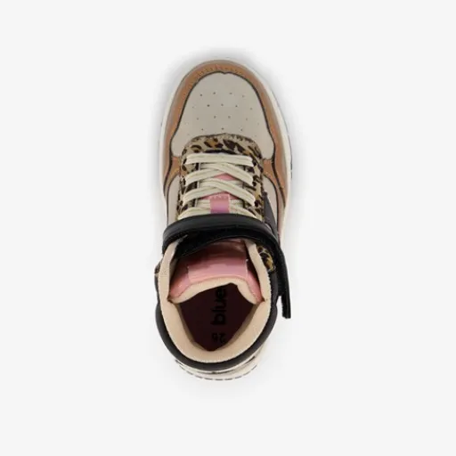 Hoge meisjes sneakers met metallic gouden details uit de Blue Box collectie. Gemaakt van imitatieleer met een binnenwerk van textiel en een stevige profielzool van rubber. Voorzien van elastische veters met een klittenbandsluiting voor een optimale pasvorm. Het buitenwerk van deze mooie sneakers wordt versierd met glitters en een inzet met tijgerprint. Het comfortabele voetbed van textiel is niet uitneembaar.