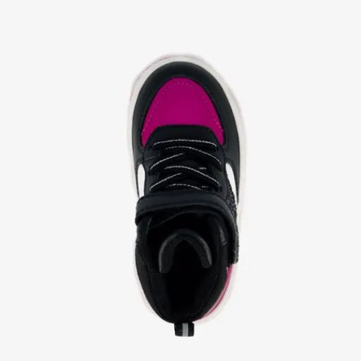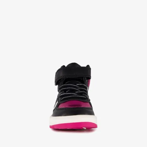 Hoge, zwarte sneakers voor meisjes. Gemaakt van imitatieleer, een binnenwerk van textiel en een rubberen zool. De sneakers hebben elastische veters met klittenbandsluiting en een hiellusje voor een makkelijke instap. Het comfortabele voetbed is gemaakt van textiel en is uitneembaar. Voorzien van witte/roze accenten op het bovenwerk en glitter.