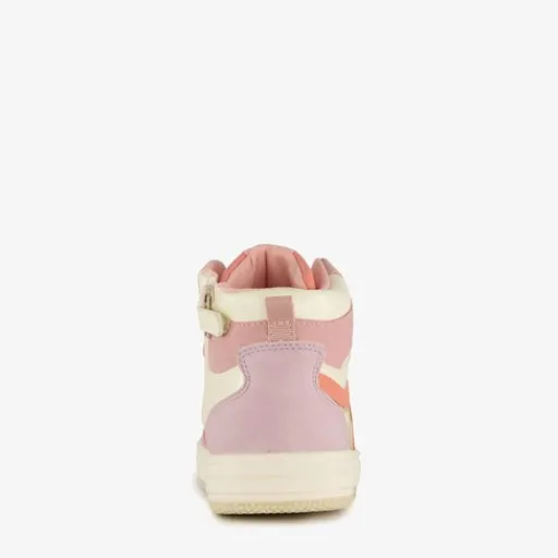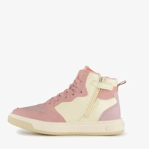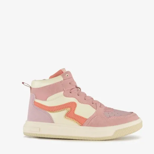 Pastelroze, hoge meisjes sneakers van Blue Box. Gemaakt van imitatieleer met een binnenwerk van textiel en een stevige profielzool van rubber. Voorzien van een ritssluiting met een klittenbandje aan de binnenzijde en een vetersluiting voor een optimale pasvorm. De sneakers hebben hiellusjes en een comfortabele binnenzool van textiel. Deze is niet uitneembaar. Het buitenwerk van de schoenen wordt versierd met pasteloranje en pastelgele details.